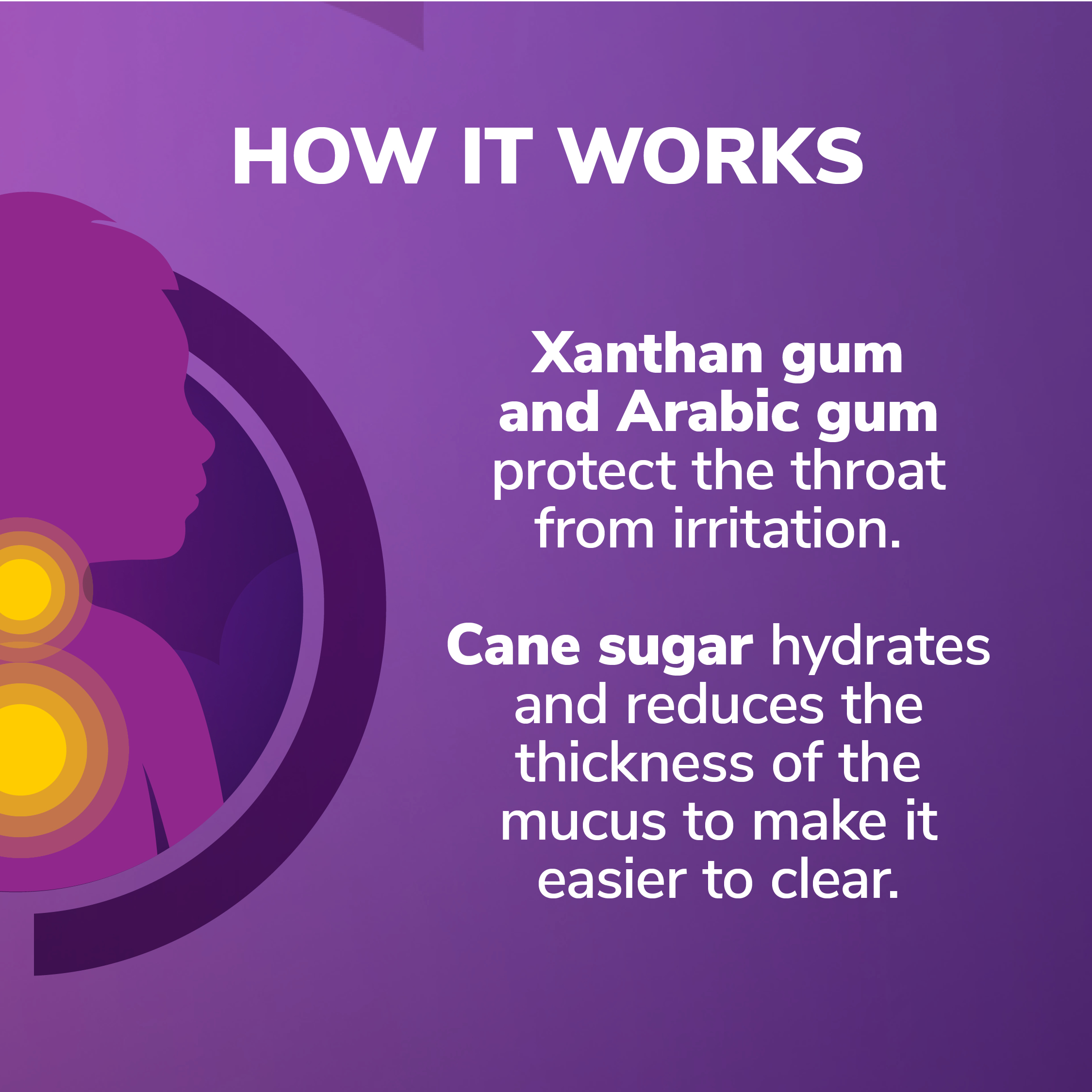 - Congested or Chesty cough: VIVIO® Junior Cough Syrup also hydrates and reduces the thickness of the mucus thanks to the cane sugar, which stimulates saliva and increases the water content in the mucus to make it more fluid and easier to clear.